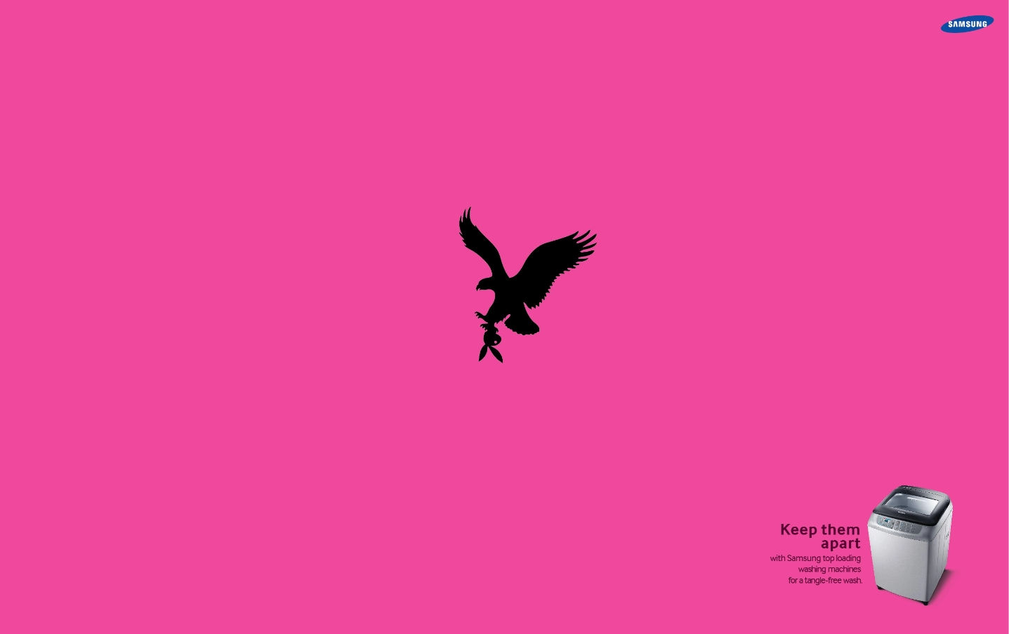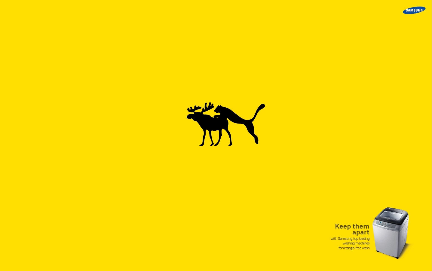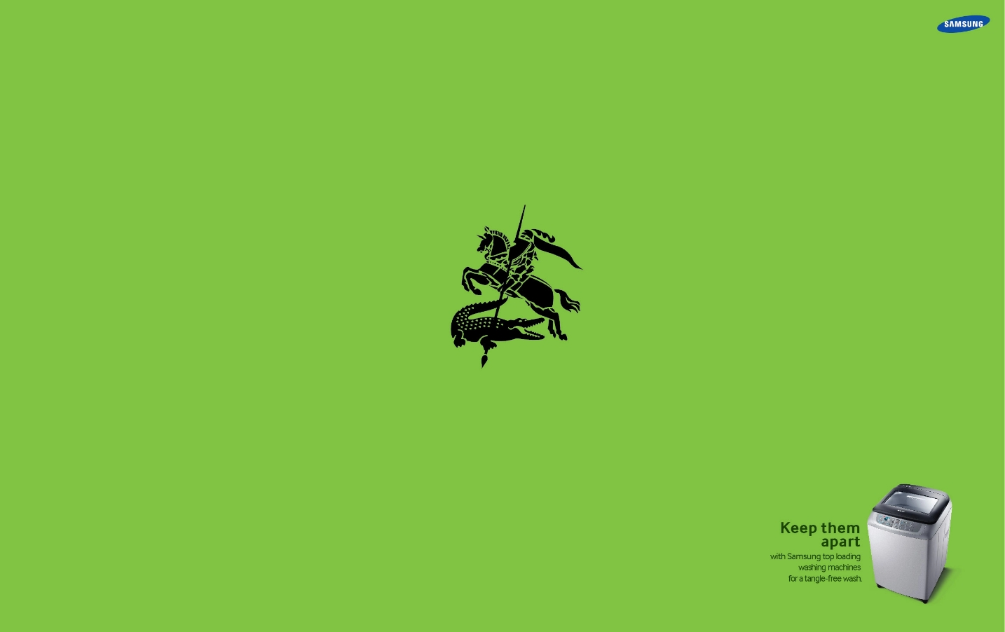 Visual storytelling through tangled brands: Instead of showing washing machines or washing cycles, the ad uses a visually creative narrative to depict renowned clothing brands’ logos tangled together. This symbolises the damage and entanglement caused by regular washing machines while hinting at samsung’s solution.