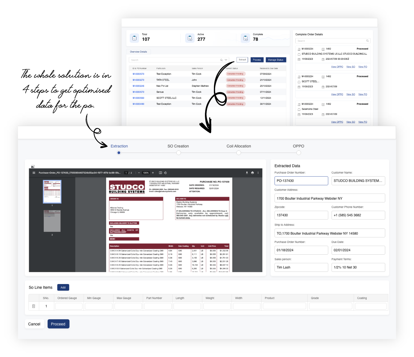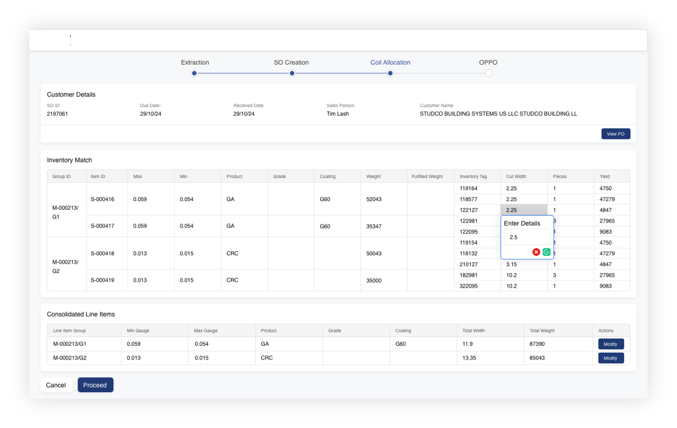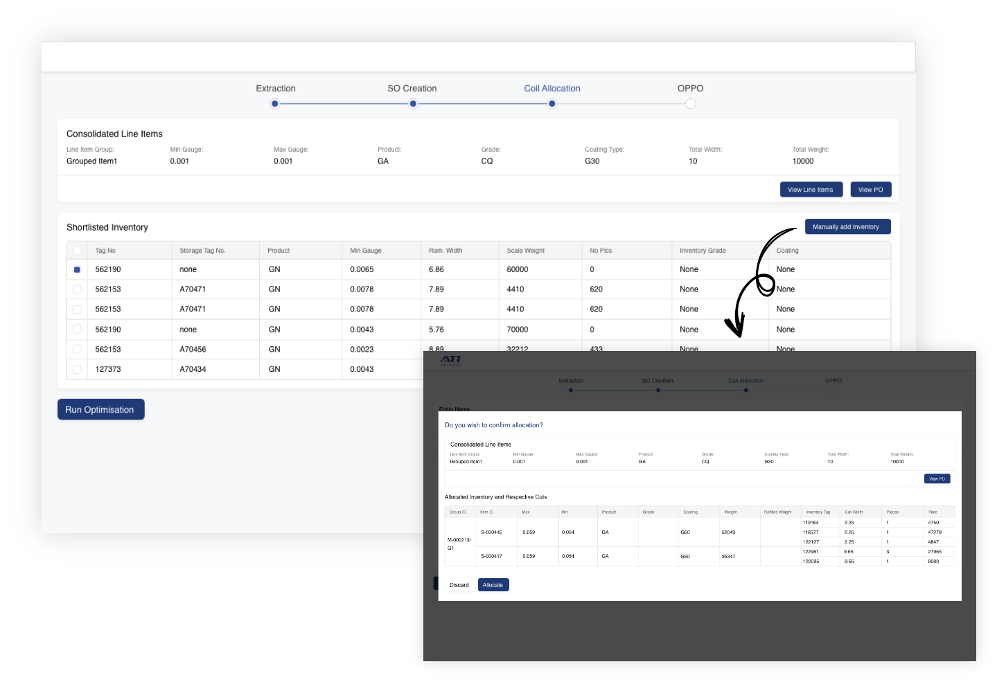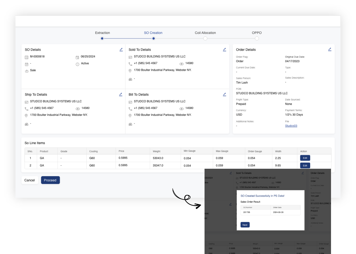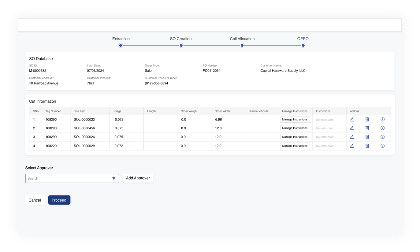 Once the OPPO is generated, it is sent for approval before proceeding to the processing unit. This includes the creation of the SO with all optimized and edited inventory details listed for final validation.
