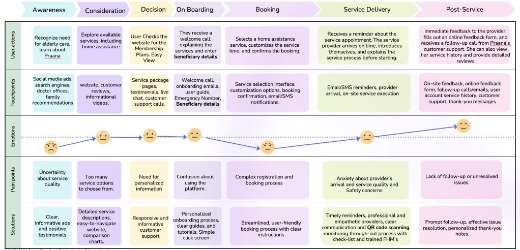 booking a service through Praana’s Elderly App, highlighting their actions, emotions, pain